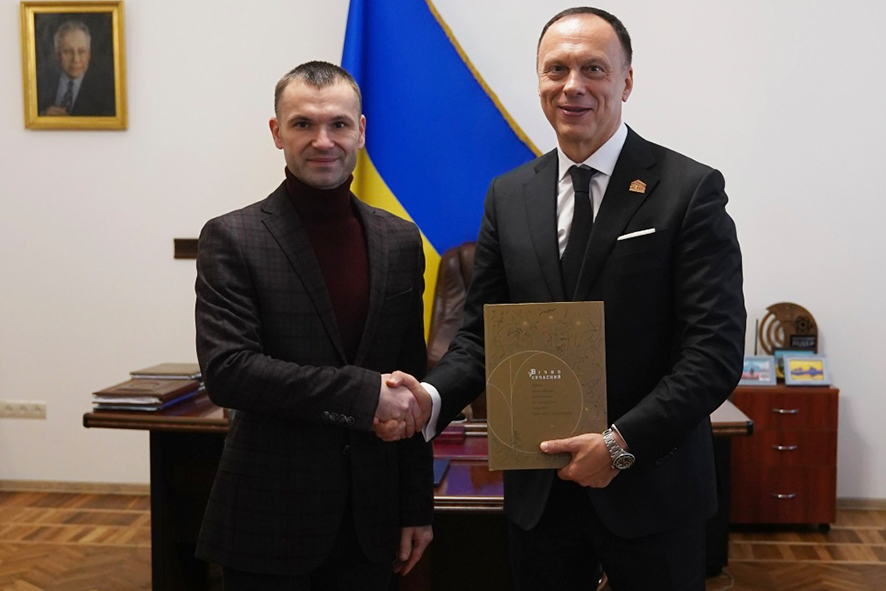 Під час зустрічі пан Юрій Бошицький від імені колективу Київського університету права НАН України вручив вітальну адресу славетному колективу Академії та подяку її ректорові – Максиму Тимошенку.