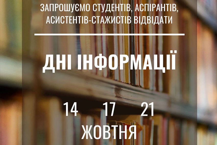 14,17 та 21 жовтня в Національній музичній академії України імені П. І. Чайковського відбулися Дні інформації для студентів, аспірантів та асистентів-стажистів на тему: «Знайомство з ресурсами бібліотеки, системою обслуговування та правилами користування».