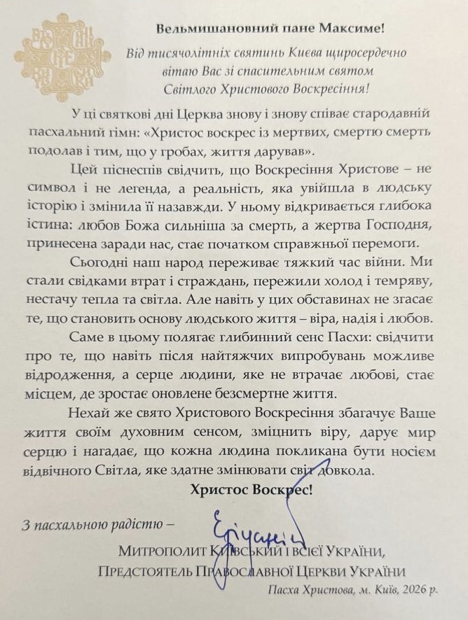 У дні світлого свята Воскресіння Христового до колективу Національної музичної академії України надійшли теплі вітання від Предстоятеля Православної Церкви України.