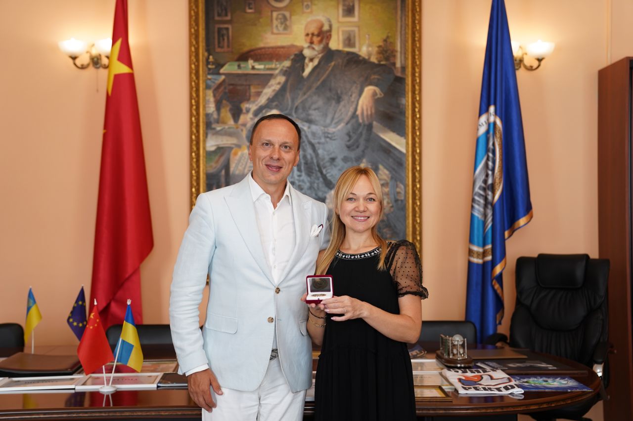 Максим Тимошенко привітав з першим робочим днем у Музичній академії народну артистку України, солістку Національної опери України, солістку міжнародного музичного проекту “Я з тобою” Лілію Гревцову та подарував прекрасній співачці Пам’ятну медаль консерваторії.