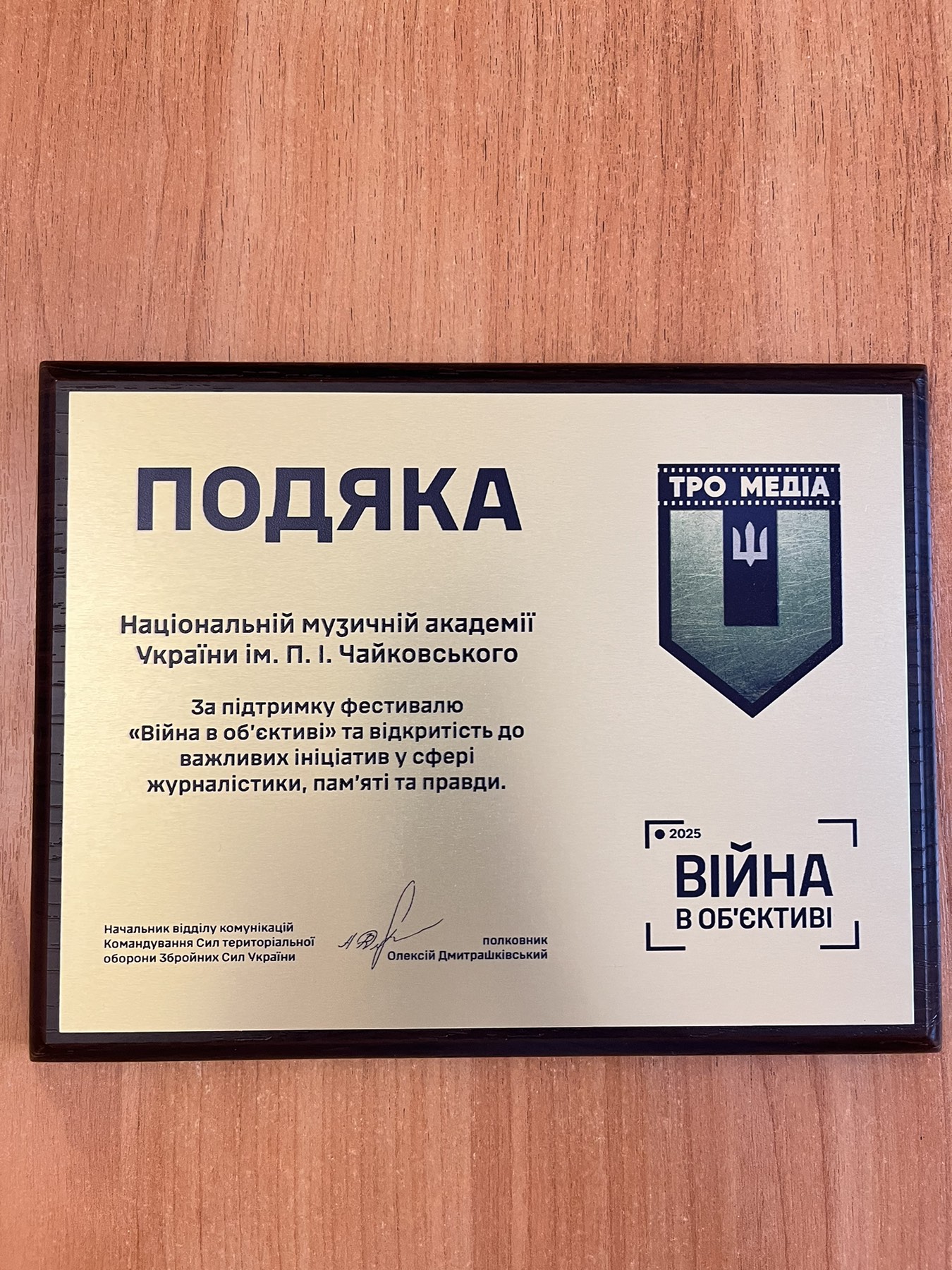 Ахтем Сеітаблаєв вручив Подяку ректору НМАУ ім. П. І. Чайковського від начальника відділу комунікацій Командування сил територіальної оборони Збройних Сил України полковника Олексія Дмитрашківського – за активну громадянську позицію та підтримку ЗСУ.