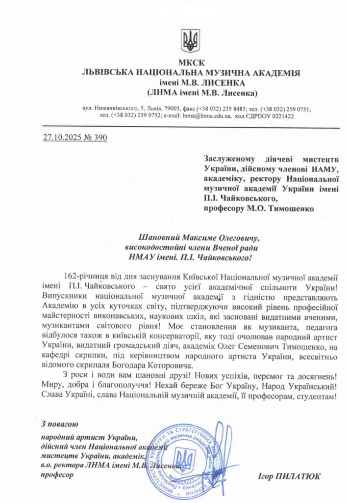 Вітальний лист колективу НМАУ ім. П. І. Чайковського від ЛНМА ім. М. В. Лисенка