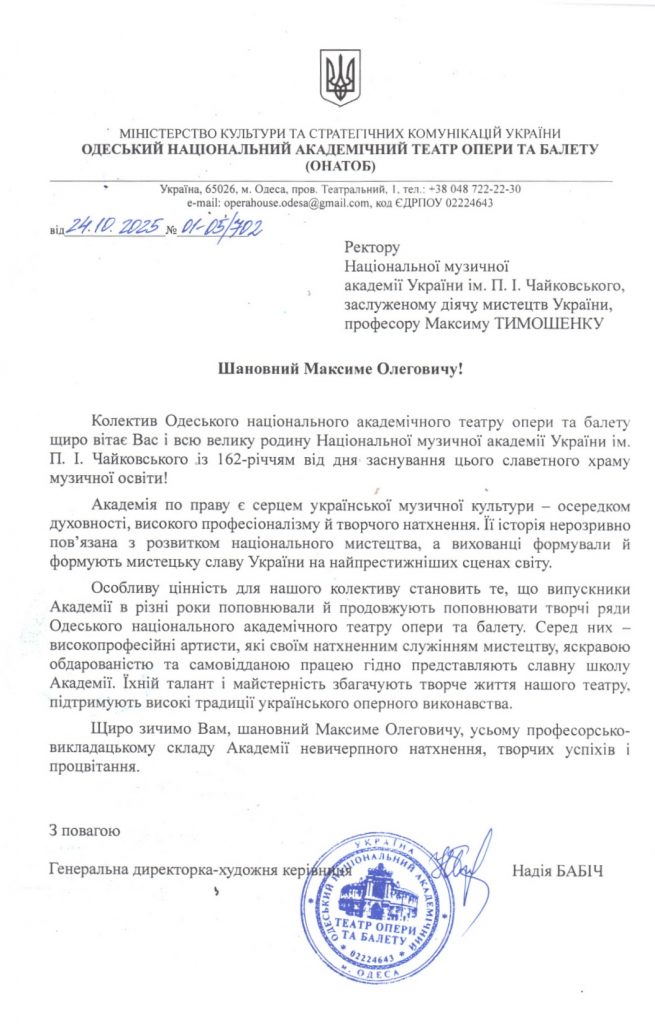 Серед вітань – теплі слова від провідних музичних вишів країни, консерваторій Європи, культурних центрів та партнерських інституцій, з якими НМАУ пов’язують багаторічні творчі зв’язки.