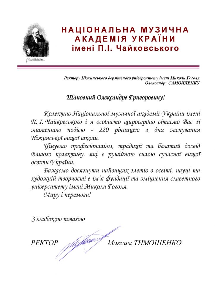 Колектив Національної музичної академії України імені П. І. Чайковського на чолі з ректором Максимом Тимошенком привітали колег із Ніжинського державного університету імені Миколи Гоголя зі знаменною подією – 220-річчям від дня заснування Ніжинської вищої школи.