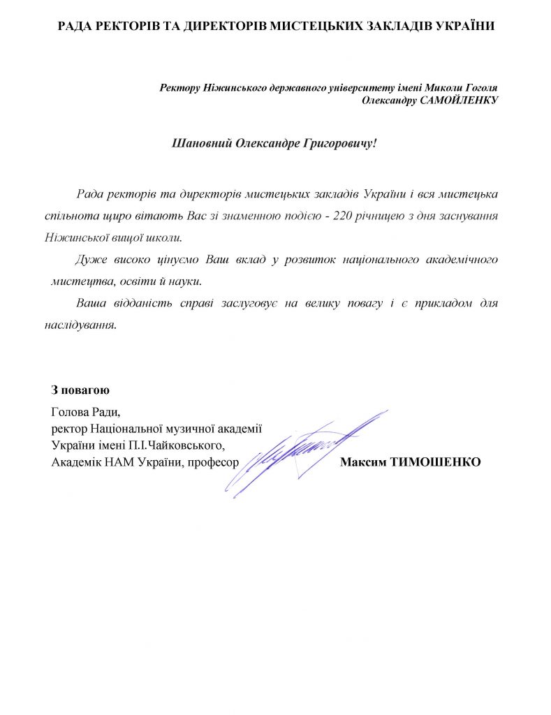 Вітання Ніжинському державному університету імені Миколи Гоголя з нагоди 220-річчя від дня заснування